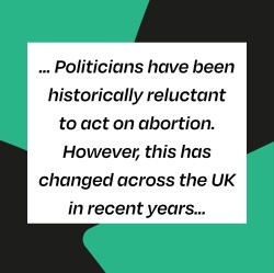 Politicians have been historically reluctant to act on abortion. However, this has changed across the UK in recent years, with numerous positive steps forward. Northern Ireland has decriminalised abortion, making it available on request up to 12 weeks gestation.